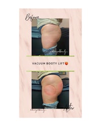 A nonsurgical butt lift with a suction device that promotes a fuller, more lifted and shapely bum. The treatment is carried out with cups that are connected to a special machine, the cups are manipulated and or handled in a special way to achieve desired effects such as removal of cellulite, body contouring, firming as well as lifting. This is a non-invasive procedure to enhance appearance of the buttocks without the need of silicone injections or surgery. This works by moving fat cells from other areas of the body into the butt tissue, therefore making the butt more developed. The booty is treated to receive a rounder, toned appearance without surgery. One hour equals 1500 squats!